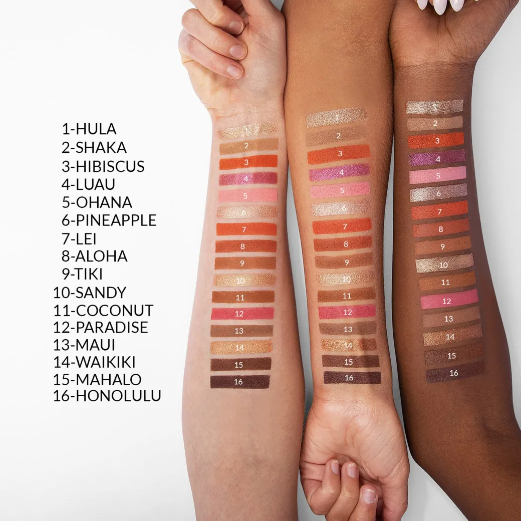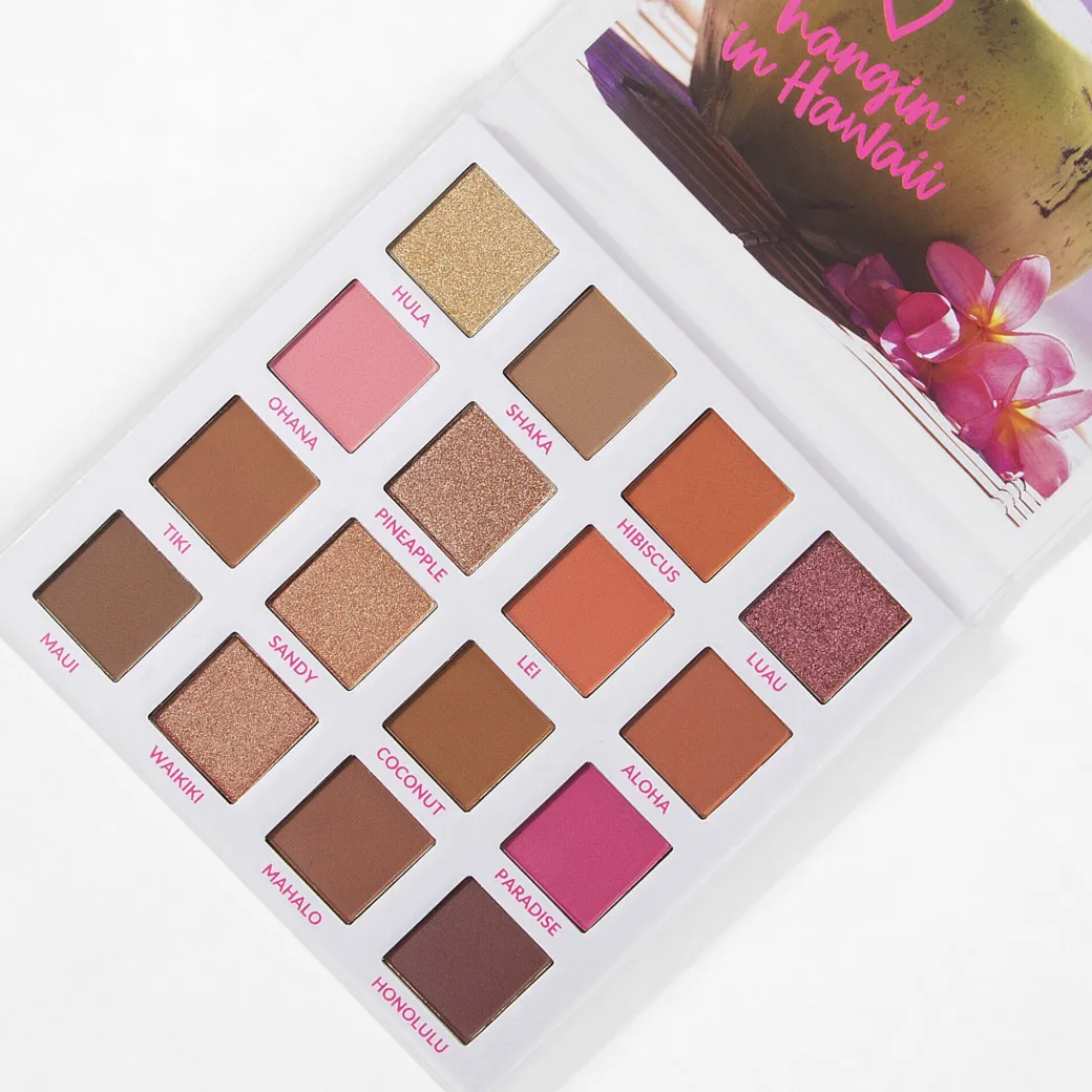 Si vous aimez les piña colada et les plages de sable fin, dites « Aloha » à un petit paradis tropical avec notre palette de 16 fards, Hangin’ in Hawaii. Cette harmonie de teintes vegan pigmentées au tons rappelant le sable fin, la noix de coco, la pastèque et les épices vous permettra de réaliser des looks lumineux et longue tenue, parfaits pour les journées ensoleillées tout comme les soirées estivales. Une harmonie d’oranges chauds et de roses neutres. Des fards mats onctueux pigmentés et des fards irisés étincelants. Une formule modulable, facile à dégrader et longue tenue.