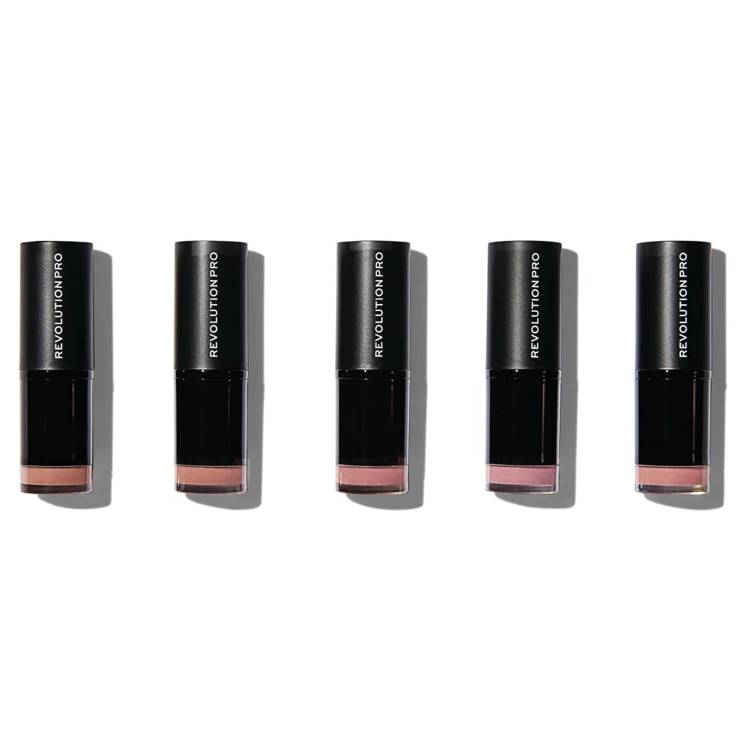 Ensemble de cinq nuances chair dans une formule mat confortable, la collection Revolution PRO Lipstick Mate Nude est le moyen idéal de créer des lèvres naturelles et pulpeuses.