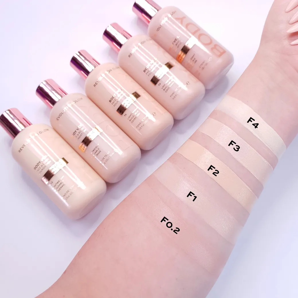 Le fond de teint Revolution Body Veil Foundation est disponible en 15 teintes incluant un large éventail de carnations :