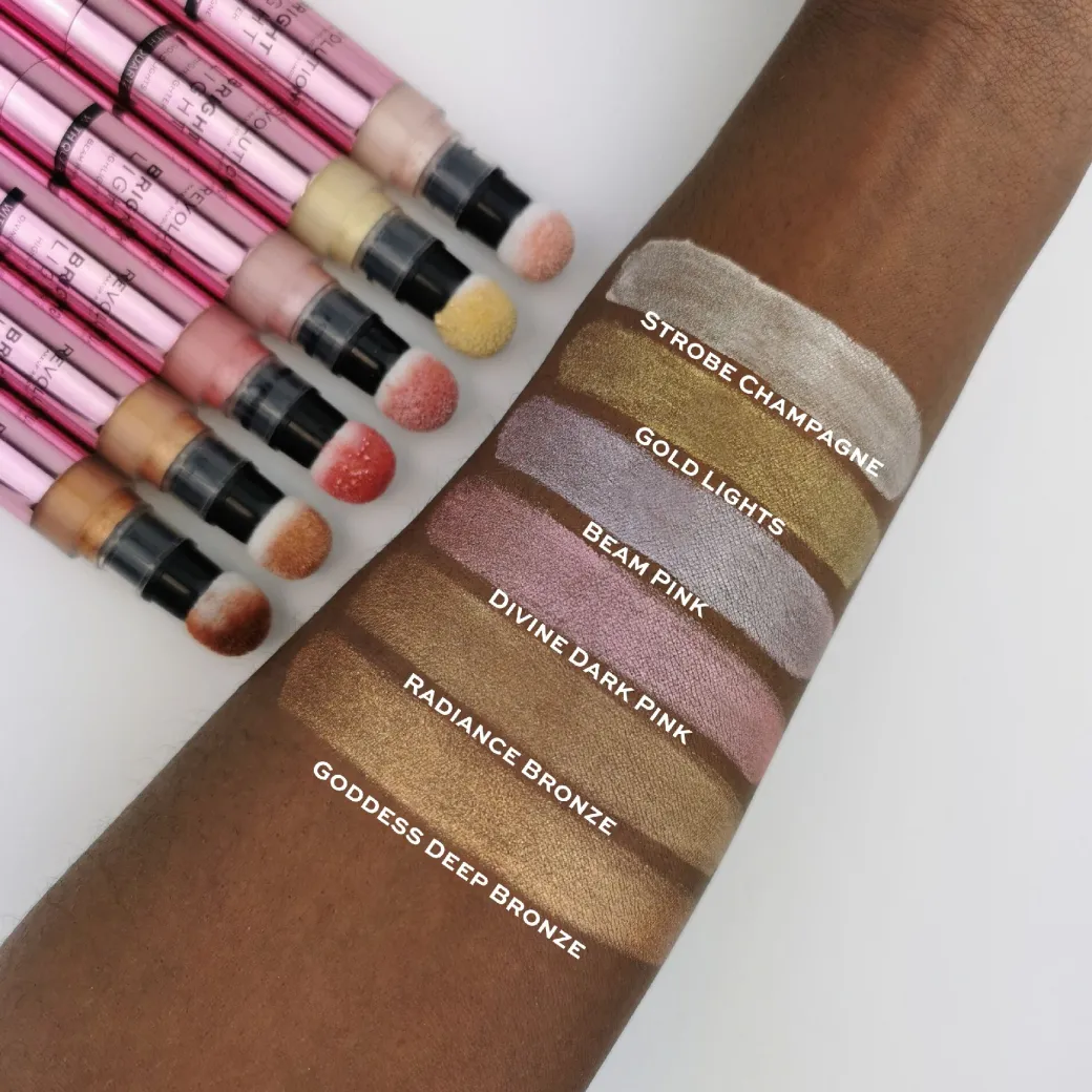 Nouveauté : les highlighters Revolution Bright Light. L’applicateur-mousse de ces highlighters en stick infusés de poudres de minéraux vous permet d’obtenir un glow lumineux en un instant. Appliquez avec parcimonie pour un glow naturel ou ajoutez du produit progressivement pour un look vraiment éclatant. Disponible en 6 teintes :