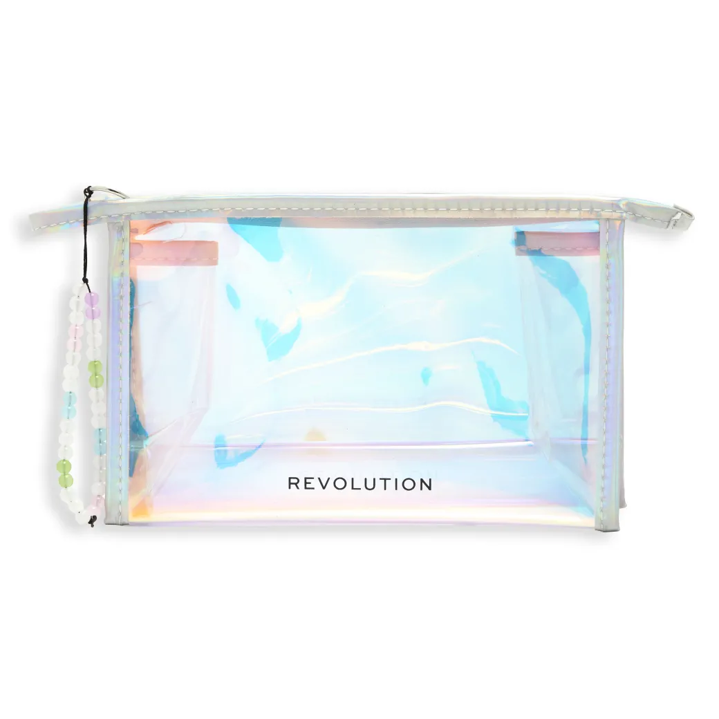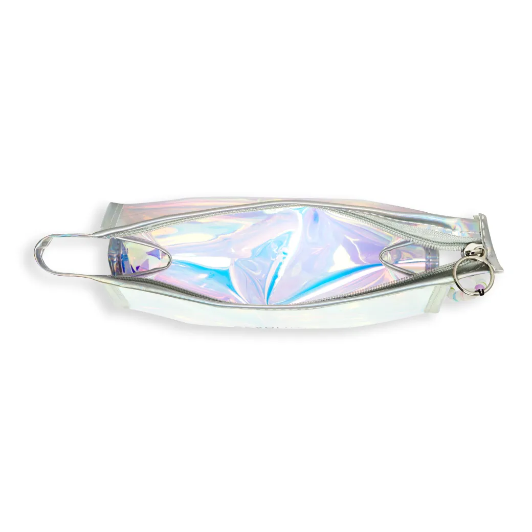 Rangez vos essentiels beauté avec style pour la saison des festivals et au-delà avec cette trousse à maquillage holographique, ornée d’une breloque à perle.