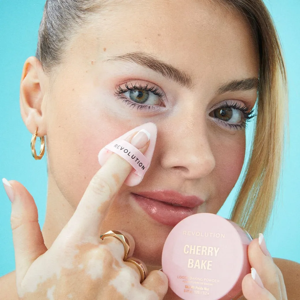 Secouez au préalable votre pot de poudre Cherry Bake. Prélevez la poudre avec la houppette en forme de cœur. Retirez l’excédent sur le dos de votre main. Appliquez délicatement avec la houppette, en vous concentrant sur le dessous des yeux, et autour du nez et de la bouche.