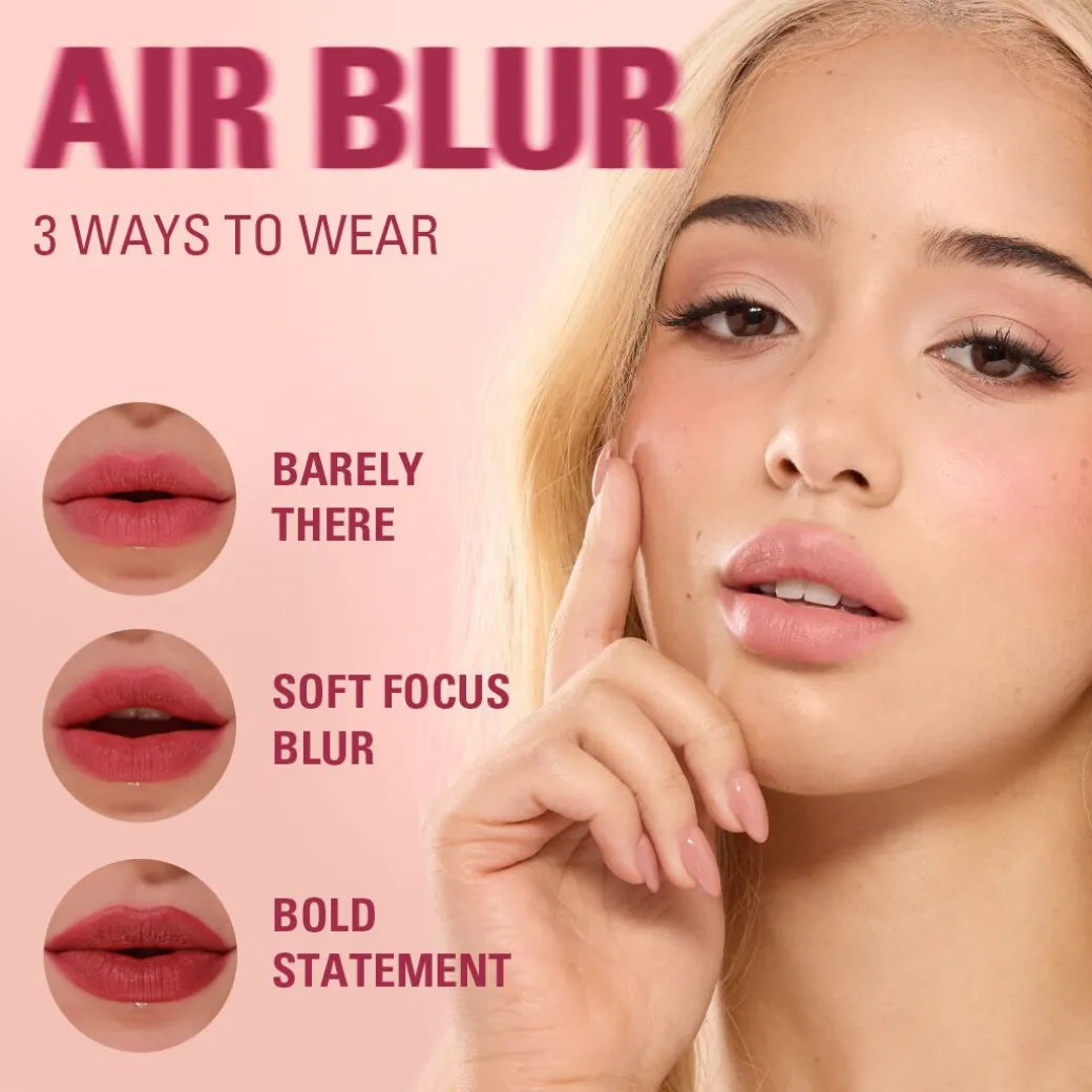 Introducing Air Blur – moisturising matte liquid lipsticks for dreamy lips that demand attention…bold colour with a nourishing formula that cushions lips with a comforting blend of vitamin E, jojoba seed oil and meadowfoam oil for a plush, pillowy pout.
