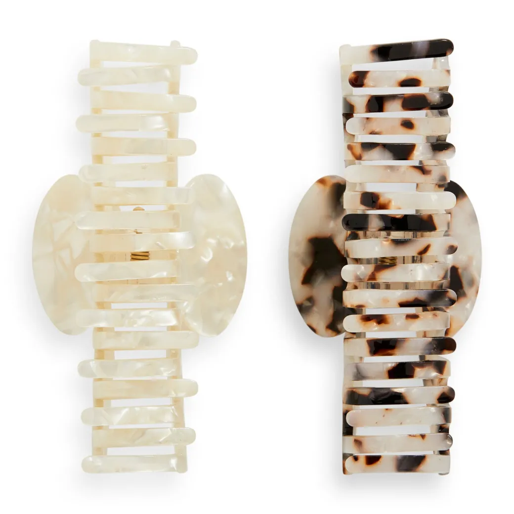 Créez des chignons sans effort en un clin d’œil avec ce lot de deux accessoires essentiels. Les pinces Acetate Claw Clips de Revolution sont des accessoires faciles à manier avec 18 dents pour bien agripper les cheveux. Chaque lot contient deux pinces à cheveux au fini écailles et ivoire.