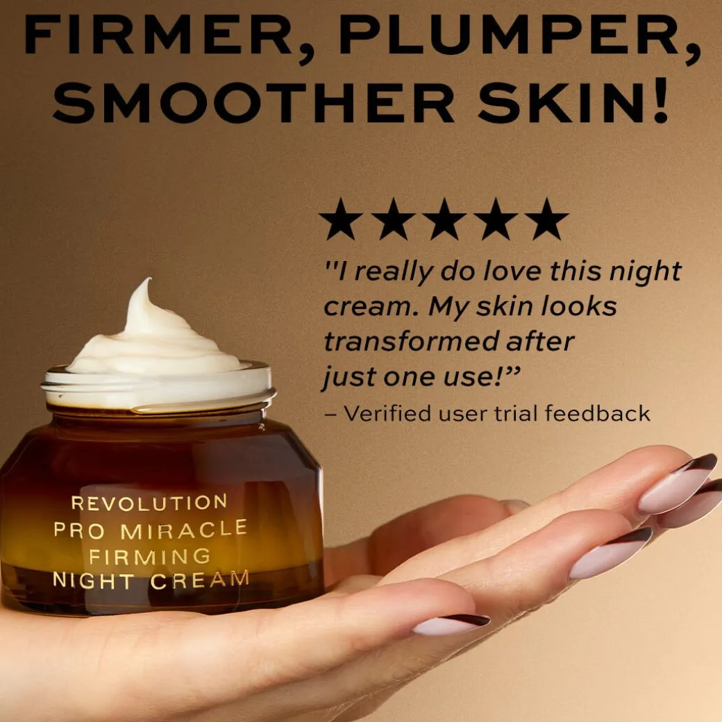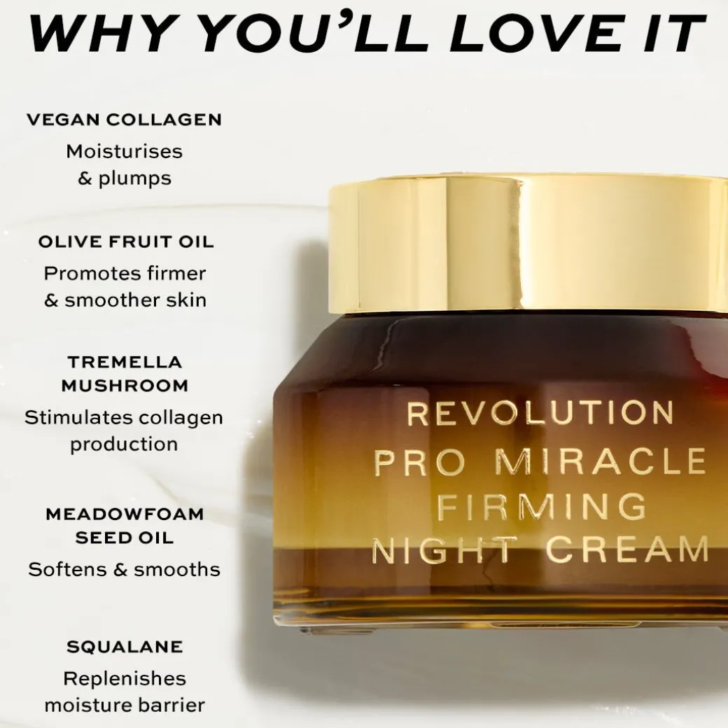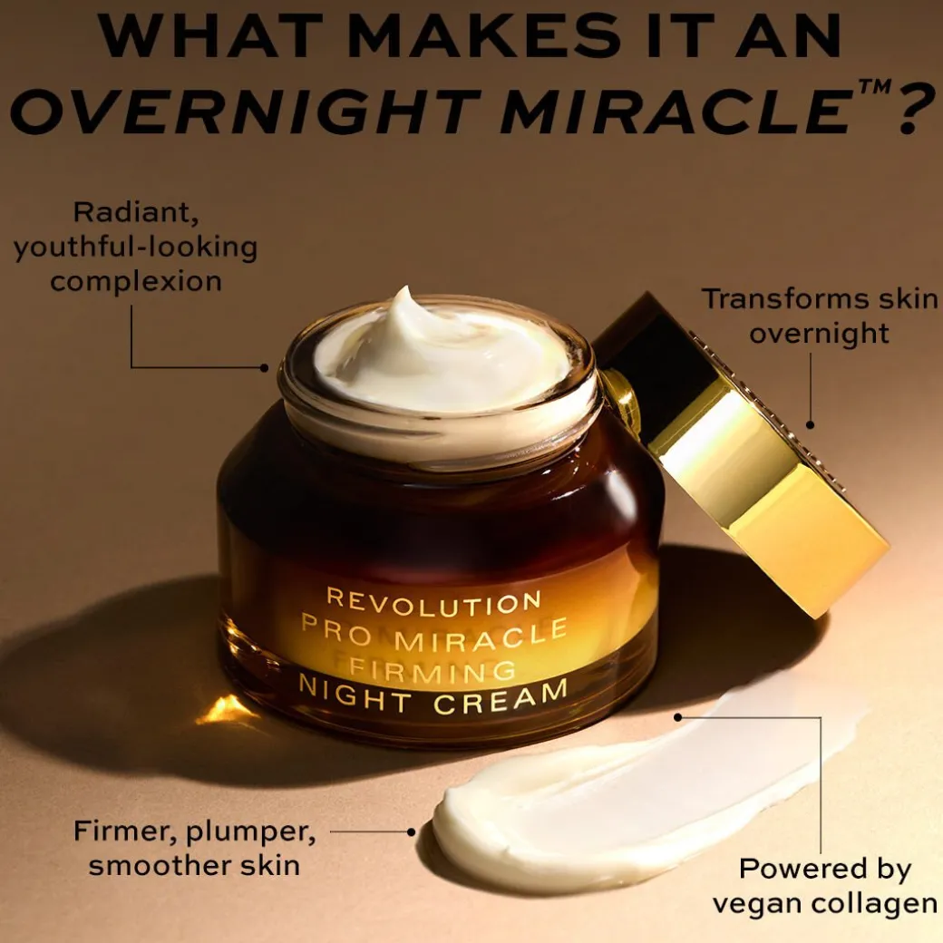 Nouveauté : la crème de nuit Miracle® Vegan Collagen Night Cream de Revolution Pro, une puissante crème hydratante inspirée par notre crème best-seller Miracle® de Revolution Pro. Enrichie en collagène vegan, cette luxueuse formule aide la peau à paraître plus jeune et plus éclatante en une seule nuit.