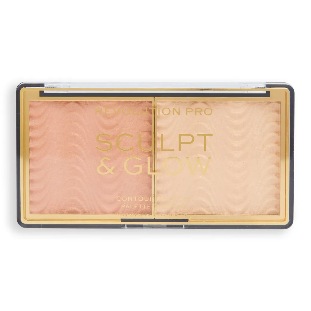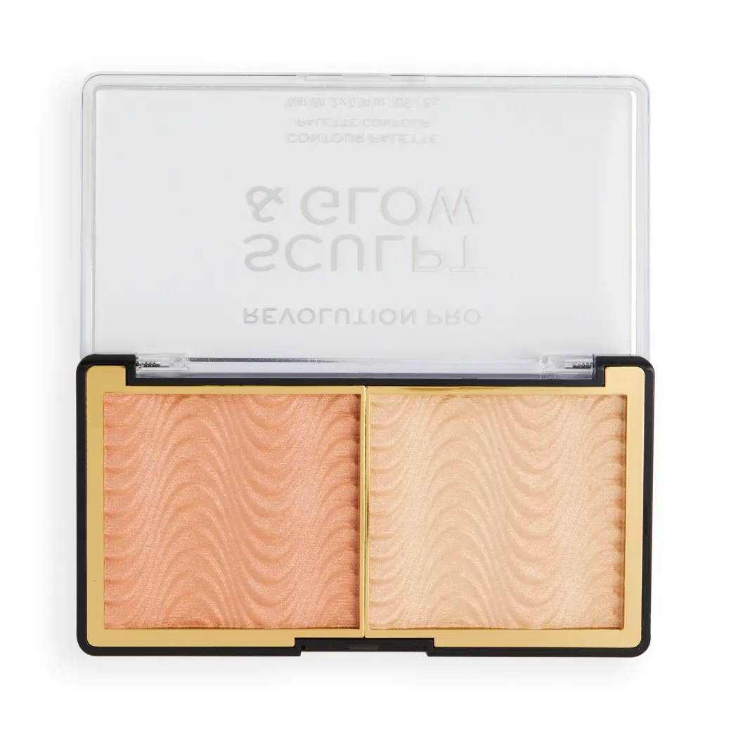 Sculpt & Glow de Revolution Pro : le duo parfait pour sculpter votre visage ! Comprend une teinte de contouring mate et crémeuse pour sculpter vos traits et une teinte irisée pour illuminer les points saillants de votre visage, le tout présenté dans une seule palette au format pratique !