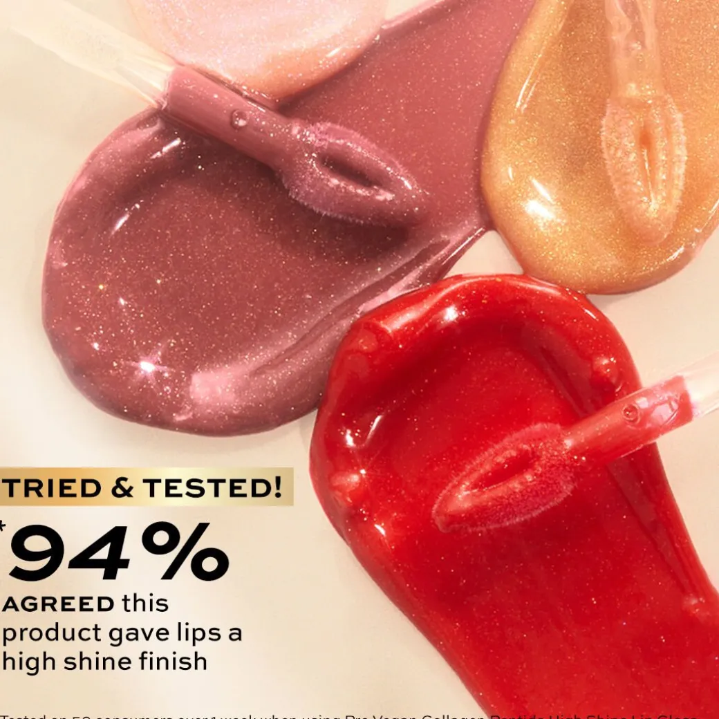 Tried and tested on our consumers, this incredible Vegan Collagen Peptide High Shine Lip Gloss has proven results: