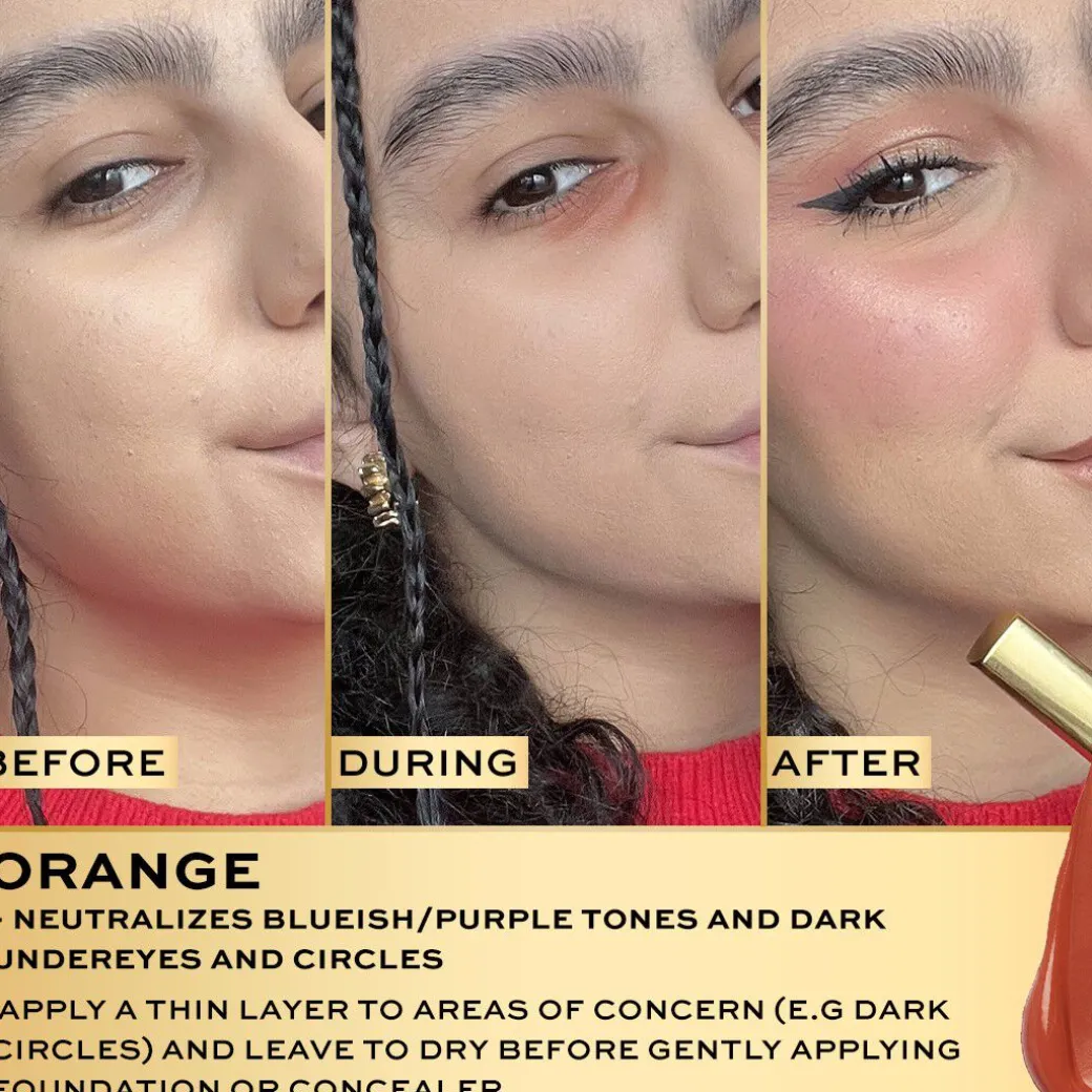 Orange – Neutralise les sous-tons bleus/violets. La solution idéale pour camoufler les cernes. Appliquez une fine couche sur la zone concernée (par exemple, vos cernes) et laissez sécher. Appliquez ensuite votre fond de teint ou votre anti-cernes.